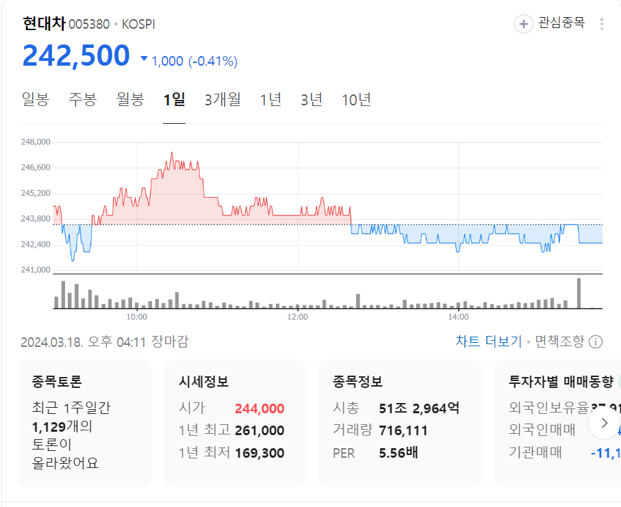 현대차 현재 주가는 242,500원이며 전일 대비 -8,000원의 모습을 보이고 있습니다. 현대차의 주주현황을 살펴보면 현대모비스 주주가 전체 지분 29.68%를 소유하고 있습니다. 현대차는 자동차 기업으로 장중 기준으로 주가는 242,500원 입니다. 현대차의 시가 총액은 51조2964억 원이며 발행 주식수는 211,531,506주 입니다. 외국인 보유 비중은 37.91% 이며 장중 거래량은 1,175,933원 을 기록했습니다. 매출액은 1,626,636억 원을 달성했습니다. EPS는 42,853원이며 현대차 주식 배당수익률은 5.60% 입니다.